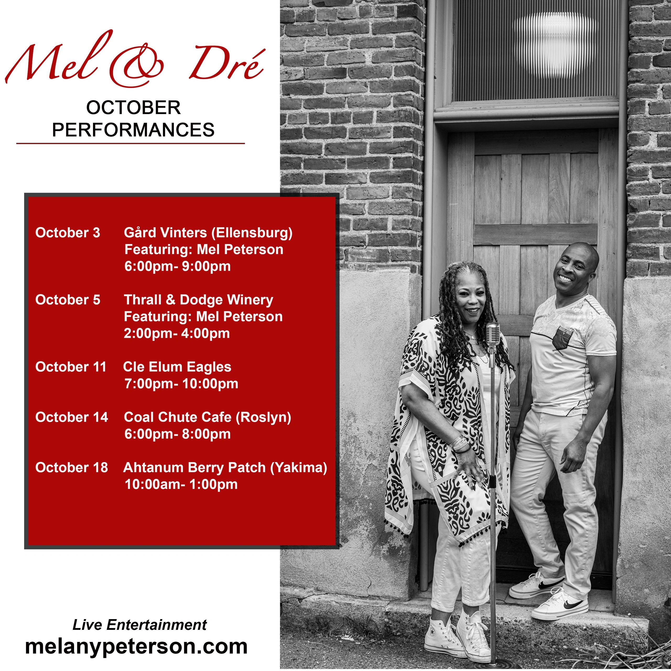 Today, this “Song Bird of the South” is the key vocalist of The Mel Peterson Quartet , The Mel and Dre' Show , The Mel Peterson Gospel Ensemble and occasionally just Mel Peterson performing a fusion of Contemporary-pop, Jazz standards, Classic Country, Gospel and R & B. You can catch her performing at Swiftwater Cellars in Cle Elum and several Wineries in Lake Chelan, Issaquah and the Snoqualmie areas. Also, other great establishments over the Kittitas and Yakima Valleys. If you’re lucky, she may be playing at a private party you’re attending. Making Ellensburg her home for the past 15 years, Mel has gathered the Ellensburg musical talent to strike the heart of those who love music.